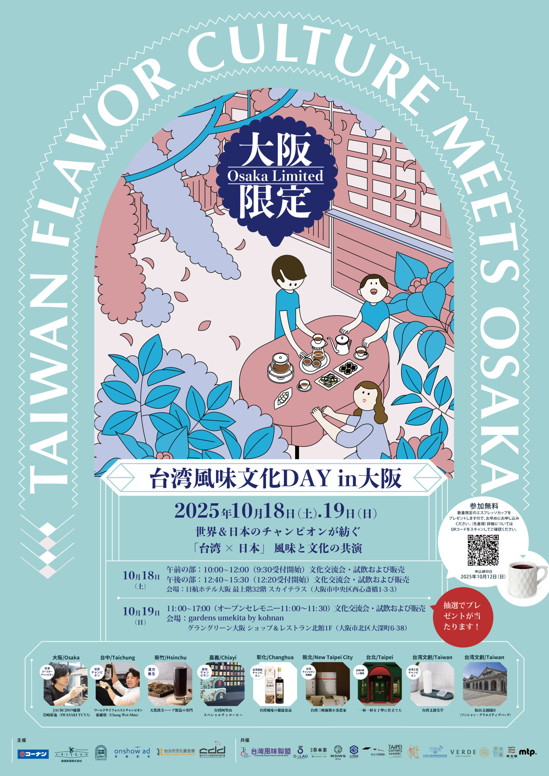 舞台は大阪日航ホテル32階スカイテラスと、コーナン商事(株)gardens umekita by kohnanコーナンガーデンズうめきた店。世界サイフォンチャンピオン・張維欣(Chang Wei-Shin)氏、JAC Roast Competition(JACRC)チャンピオン・岩崎裕也(Iwasaki Yuya)氏を迎え、台湾と日本のトップバリスタ・ロースターによる“日台チャンピオン共演”を実現します。